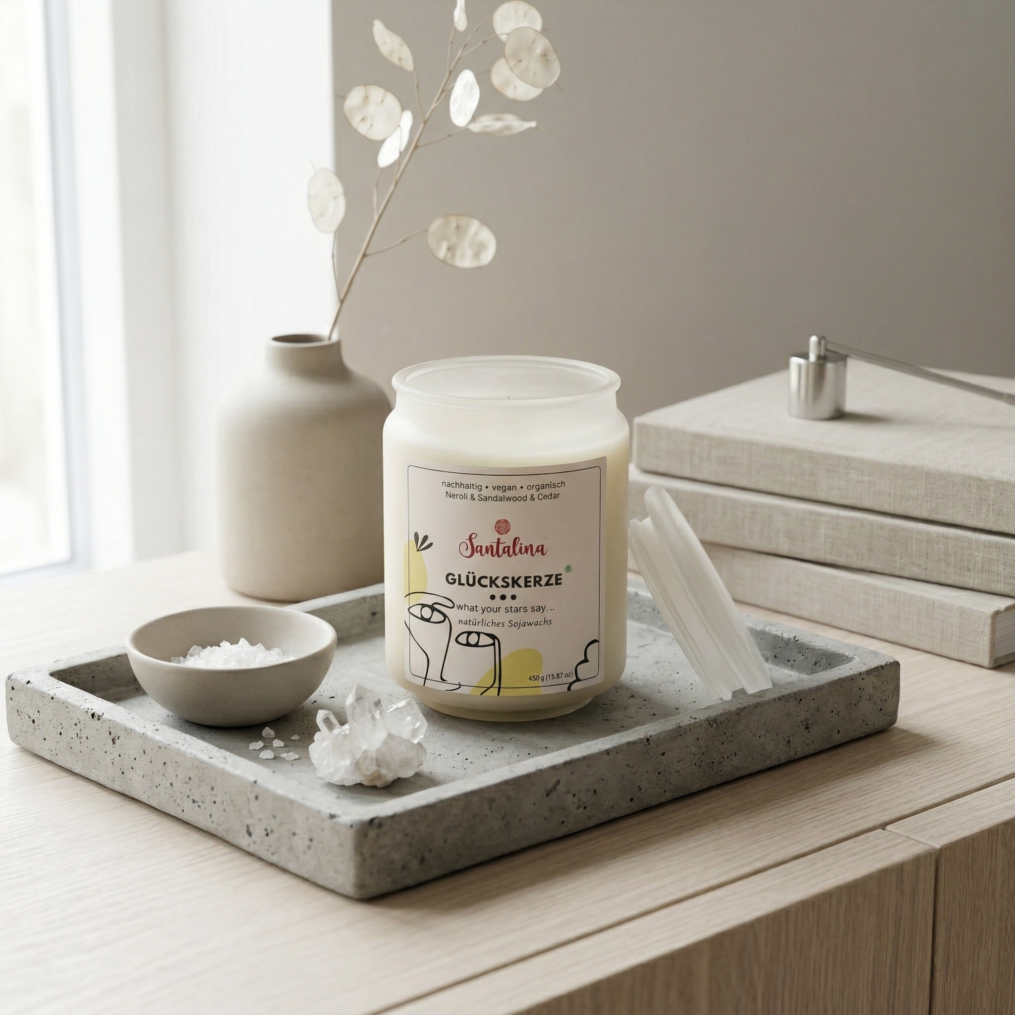 In jedem von uns schlummert noch ein Hauch von kindlicher Magie, und wir sehnen uns nach dem Glauben an etwas Übersinnliches, um dem Alltag zu entfliehen. Wir hoffen, dass unsere Produkte jedem Kunden und jeder Kundin einen persönlichen Zugang zur spirituellen Welt ermöglichen und die Gelegenheit zur Entspannung bieten. Lass dich von der Magie unserer Santalina Duftkerzen verzaubern und genieße Momente der inneren Ruhe und Inspiration.